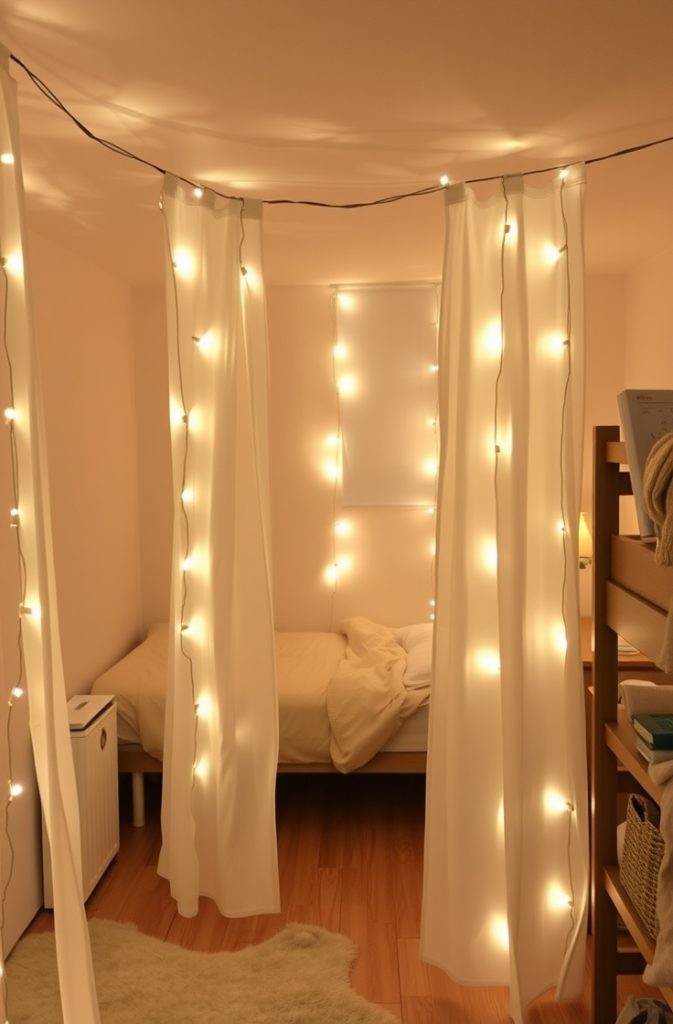 Create visual separation and a sense of privacy with hanging curtains. Use them to section off your sleeping area or closet. Tension rods and Command Hooks make this idea renter-friendly and damage-free. Choose light-colored or sheer fabric to maintain openness while still defining your zones.