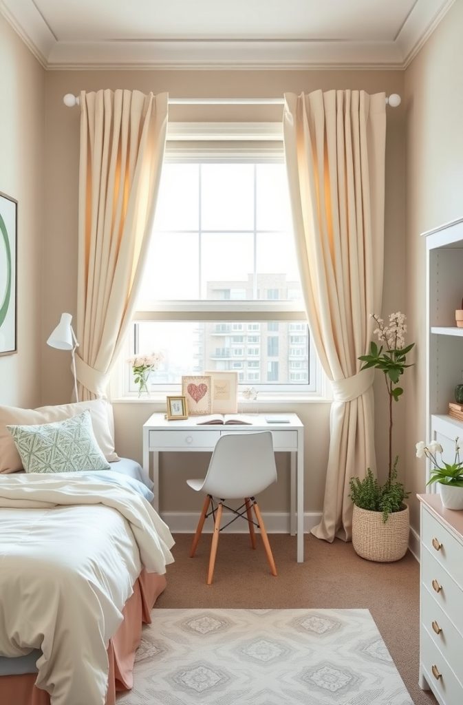 A unified color palette can make your dorm room feel larger and more organized. Whether you prefer calming neutrals or bold accents, choosing complementary tones for your bedding, décor, and accessories gives your space a clean, curated look.