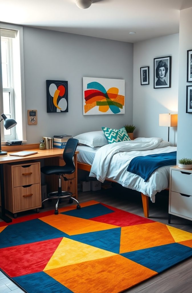 Adding a statement rug is one of the easiest ways to bring personality and warmth to a single dorm room. Since most dorm floors are cold, plain, and uninspiring, a bold rug can instantly elevate the space with color, texture, and style.