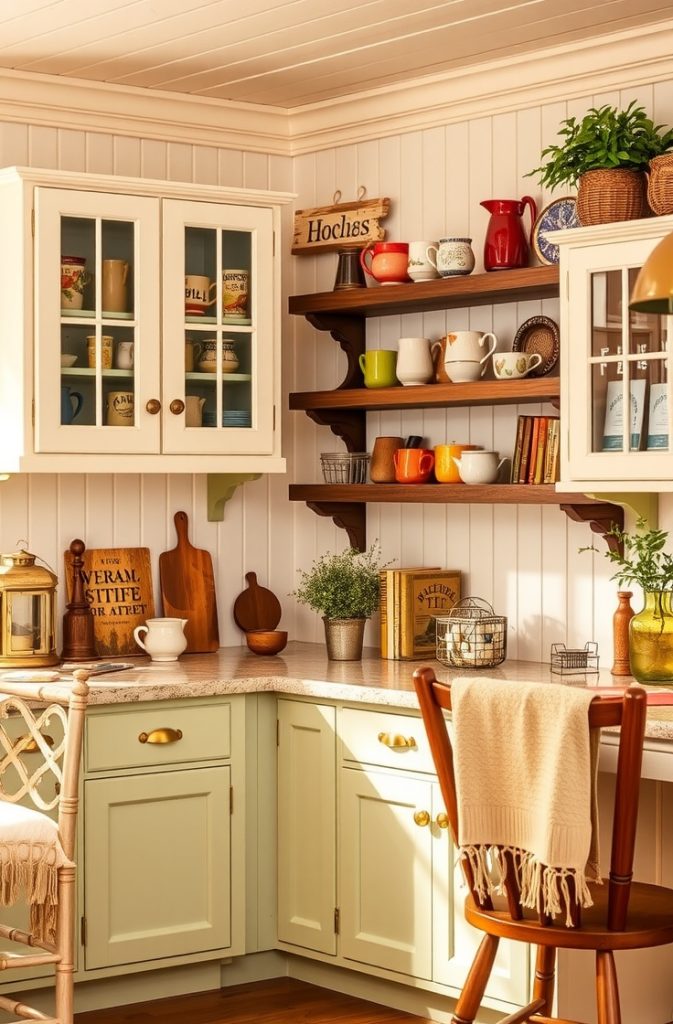 The texture of beadboard adds visual interest and a touch of vintage charm, while the sage green cabinetry or decor pieces introduce a soft, earthy tone that feels both calming and stylish. This combination is perfect for those who want a kitchen that feels warm, inviting, and rooted in timeless design, blending old-fashioned character with modern functionality.