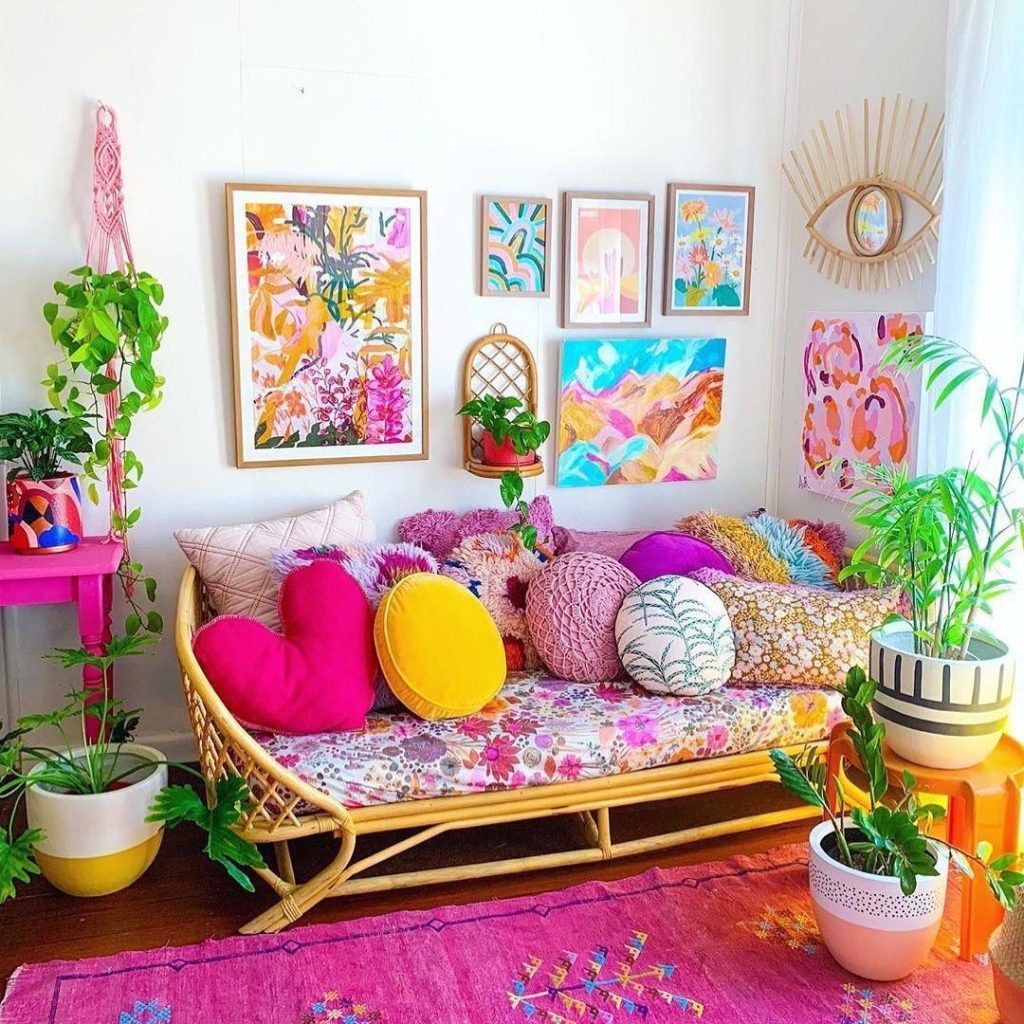 The gallery wall of colorful artwork and abundance of plants in decorative pots add layers of visual interest. This maximalist approach shows how to successfully combine multiple colors and patterns by maintaining a consistent bohemian aesthetic throughout.