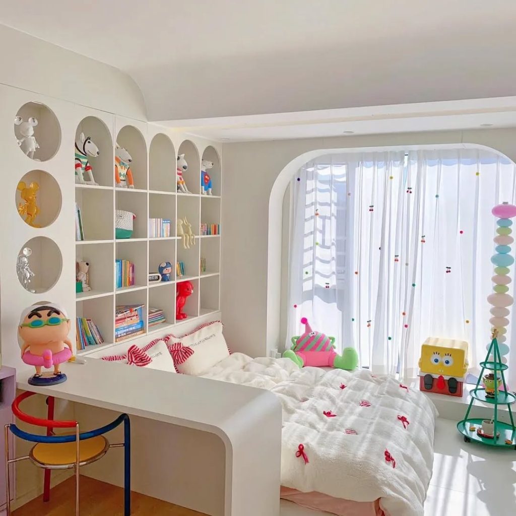 This sophisticated children’s space proves that kids’ rooms can be both functional and stylish with its clean white palette and built-in storage solutions. The curved architectural elements and circular display niches add geometric interest while maintaining the room’s serene, uncluttered aesthetic.