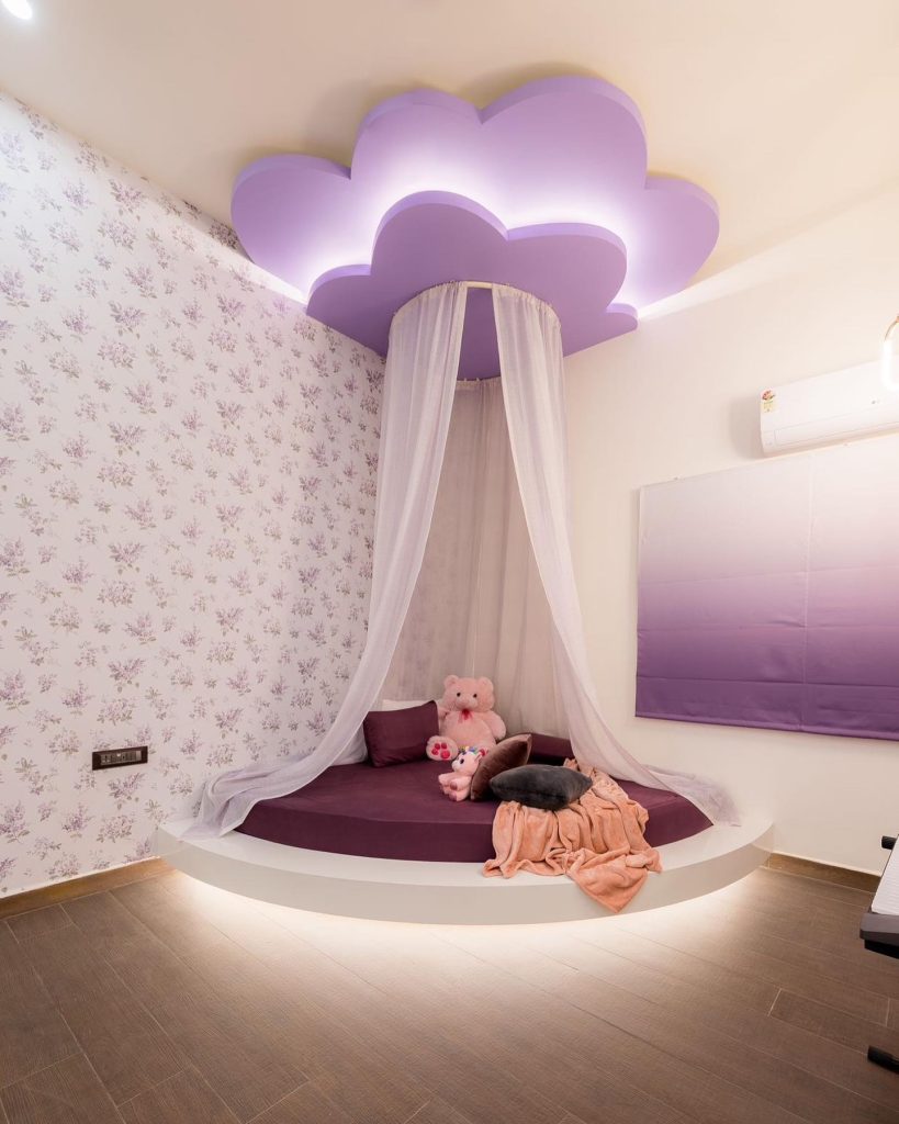 This enchanting bedroom corner features a magical cloud-shaped canopy that creates an intimate reading nook bathed in soft purple LED lighting. The whimsical design element transforms a simple corner into a fairy-tale retreat, perfect for quiet moments and imaginative play.
