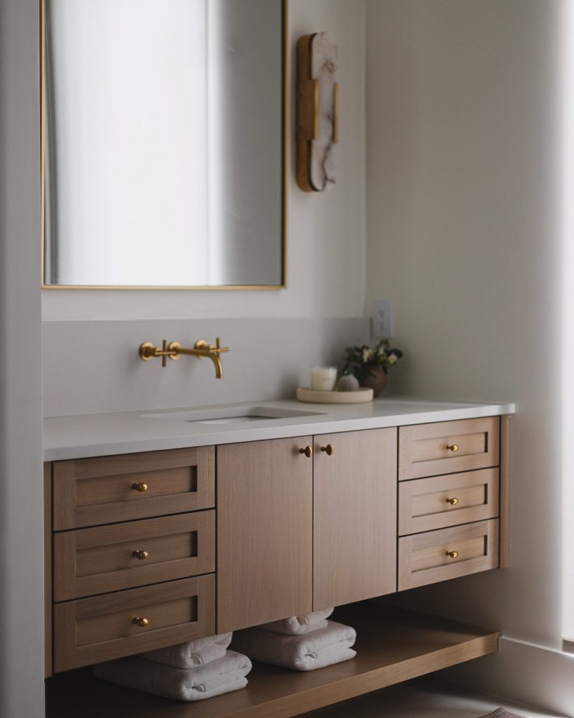 Brass fixtures complement the wood beautifully, while the simple rectangular mirror maintains the streamlined aesthetic. This approach demonstrates how natural materials can anchor a modern design without overwhelming the space.