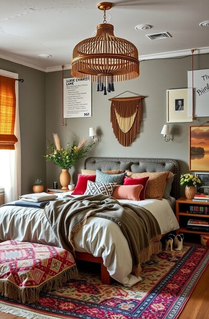 Add gold accents or a velvet chair for a hint of luxury. Plants, handmade decor, and ambient lighting complete the cozy, eclectic vibe. It’s a perfect mix of comfort and sophistication.