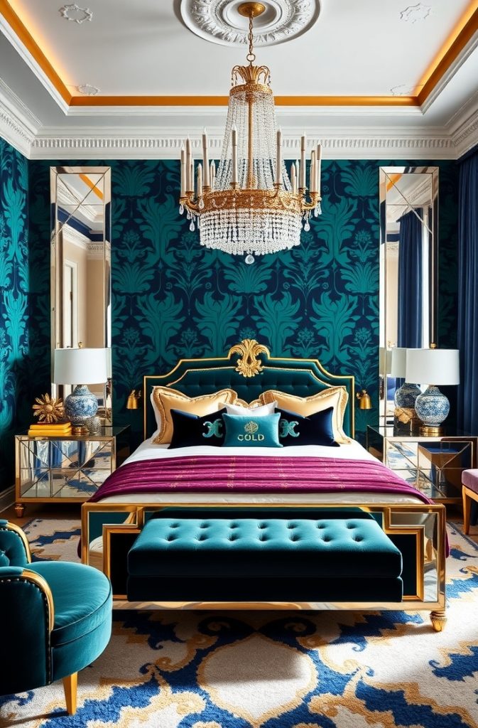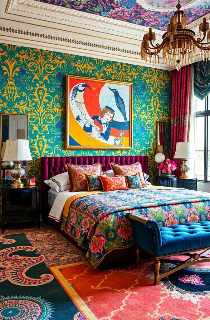 Maximalist luxury is bold, expressive, and full of personality. This style embraces rich colors, layered textures, and eye-catching patterns. In bedroom decorating, it means mixing velvet pillows, ornate wallpaper, and statement lighting.