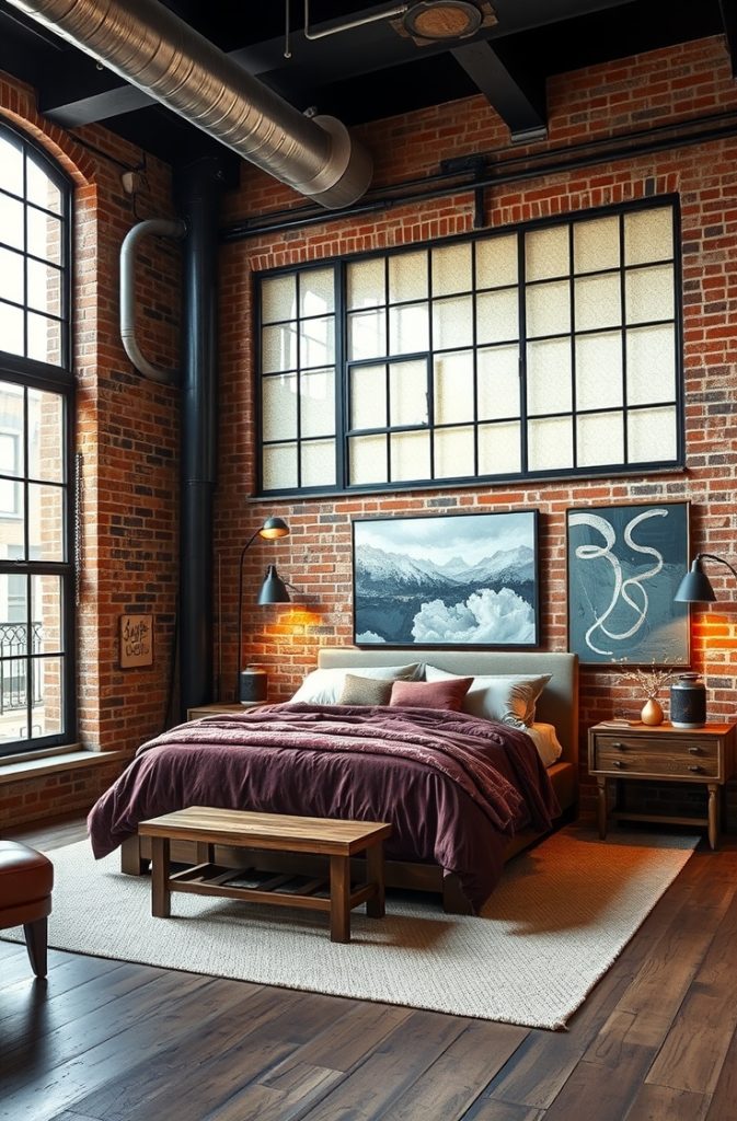 To balance the rugged textures, plush bedding, velvet accents, and statement lighting are layered in, creating a space that feels both edgy and inviting. The key to mastering this look lies in the contrast—mixing industrial elements with high-end furnishings and curated décor to transform a functional loft into a sophisticated, stylish retreat.