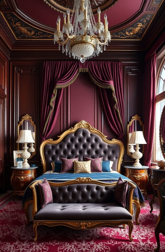 Inspired by 18th-century French and Italian aesthetics, this style is all about opulence: tufted headboards, carved wooden furniture, gilded mirrors, and silk draperies. Rich color palettes—deep burgundy, navy, and gold—add a royal touch.