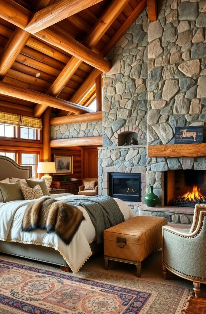A Rustic Luxury Cabin offers a warm, cozy retreat with an upscale twist. Bedroom decorating here focuses on natural materials like wood, stone, and fur. The rich textures create a comfortable yet refined atmosphere.