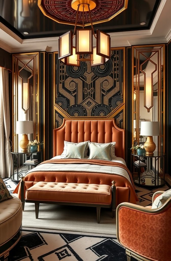 Art Deco Revival brings bold elegance to bedroom decorating. This style features rich colors, geometric patterns, and luxurious materials like velvet, brass, and marble. Furniture often has sleek lines and glossy finishes.