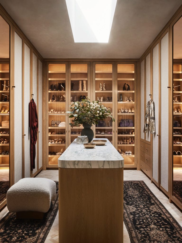 This elegant walk-in closet is flooded with natural light from a large skylight, creating a bright and airy atmosphere. The warm wood cabinetry with glass fronts offers sophisticated storage, while the marble-topped island provides a luxurious focal point. The combination of open shelving and enclosed storage creates a perfect balance between display and concealment.