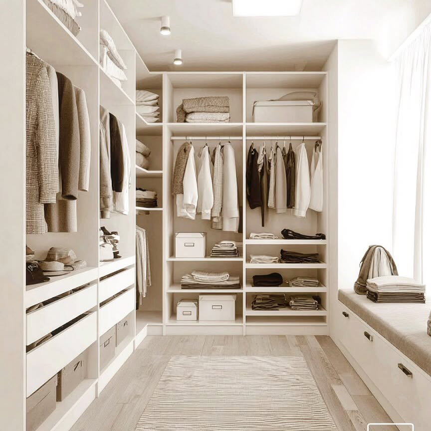 The built-in seating area and natural light from the window make this space feel like a personal dressing room. This design is ideal for fashion enthusiasts who want to display their collection like artwork while maintaining an organized, elegant environment.