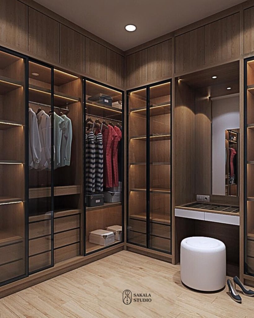 This contemporary walk-in closet embraces rich wood tones and sleek lines for a sophisticated, hotel-like atmosphere. The combination of open shelving and glass-front cabinets creates visual interest while keeping contents organized and dust-free. Integrated LED lighting strips illuminate every corner, making it easy to find items while adding a luxurious glow.