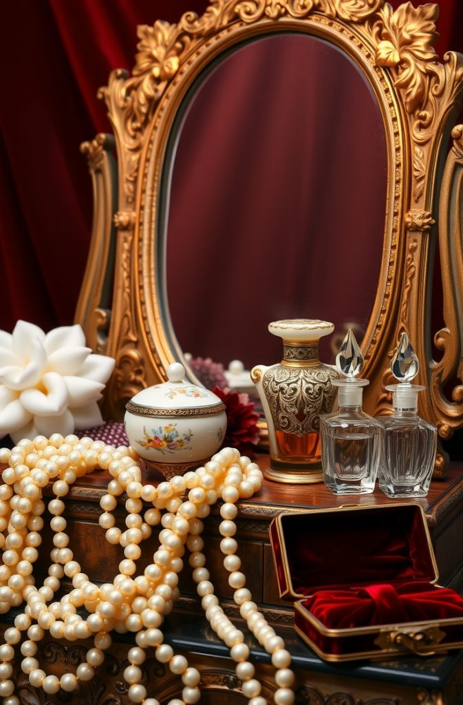 A beautifully arranged vanity table with vintage perfume bottles, pearl necklaces, makeup brushes, and soft lighting makes a luxurious wallpaper choice. It reflects the rituals of femininity and beauty.