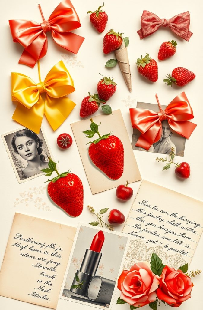 A wallpaper made from a collage of coquette elements—vintage fashion snippets, Lana lyrics, satin textures, strawberries, and lipstick marks—offers a scrapbook-style aesthetic bursting with personality.