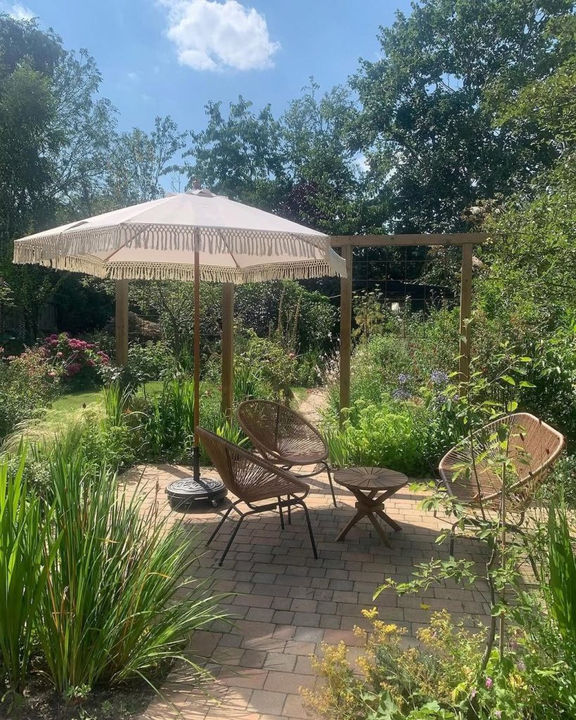 This sophisticated rustic retreat perfectly balances wild, natural growth with carefully curated comfort zones. A fringed parasol creates an intimate seating area with woven rattan chairs that invite relaxation among the lush, cottage-style plantings. The design embraces the controlled chaos of English garden traditions, where plants are allowed to grow freely and intermingle, creating a tapestry of textures and seasonal colors.