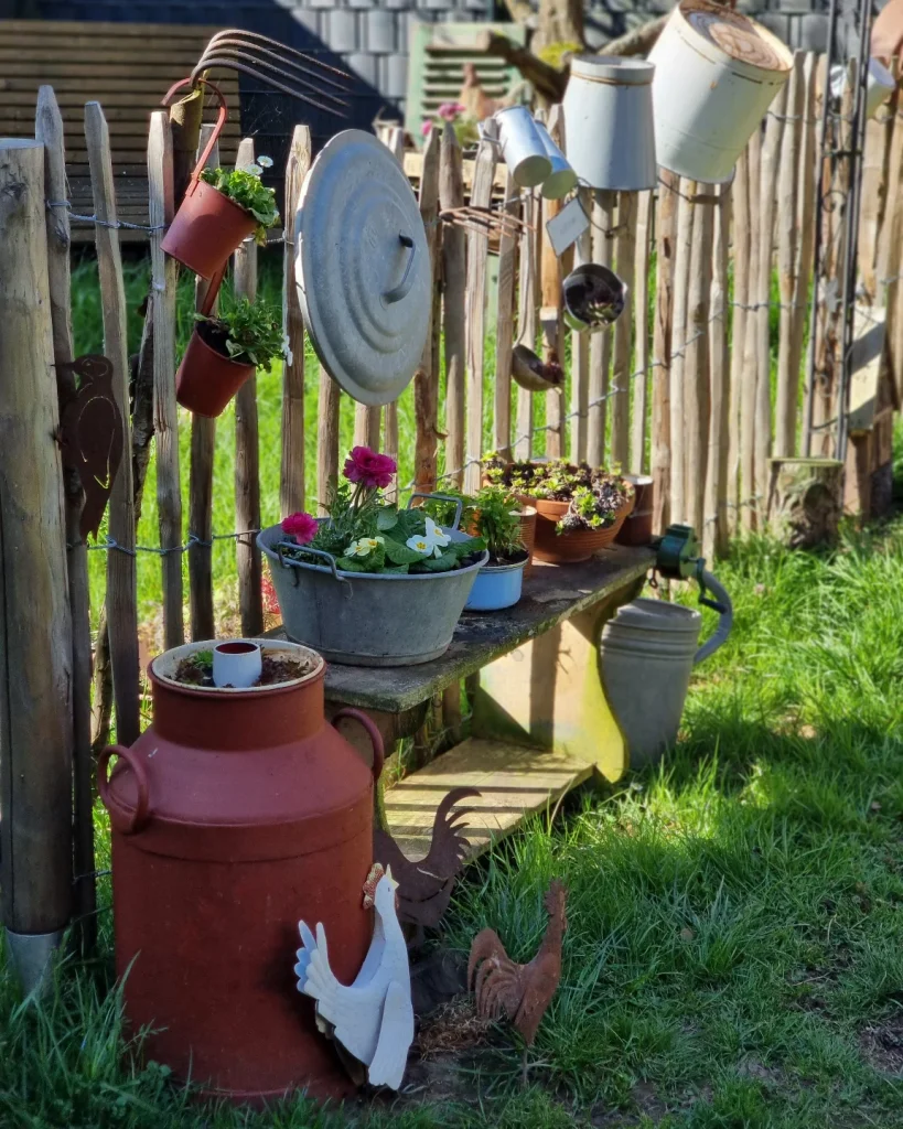 This ingenious rustic design transforms an ordinary wooden fence into a stunning vertical garden showcase that maximizes space while celebrating the beauty of upcycled materials. The weathered picket fence serves as a natural gallery wall for an impressive collection of vintage containers—from enamel colanders and rusty watering cans to ceramic planters in soft pastels. Each piece hangs at varying heights, creating visual rhythm and interest along the fence line.