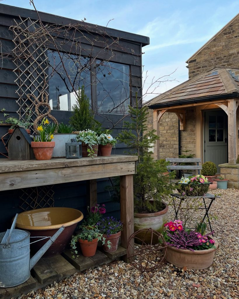 This charming design showcases how architectural salvage can create the backbone of an extraordinary rustic garden. Weathered wooden decking provides a warm foundation for an eclectic mix of terracotta containers bursting with seasonal flowers and herbs. The backdrop features a striking dark wooden shed with diamond lattice details, while the adjacent stone cottage adds authentic countryside character that grounds the entire composition.