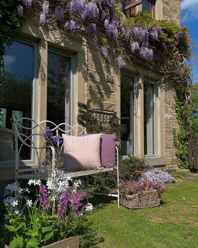 This romantic garden scene showcases the stunning impact of mature climbing plants as living architecture. Cascading wisteria creates a natural purple canopy over a charming white metal garden bench, transforming a simple seating area into a floral bower of extraordinary beauty. The combination of the ornate bench with soft cushions against the backdrop of weathered stone creates a perfect balance between elegant comfort and rustic authenticity.