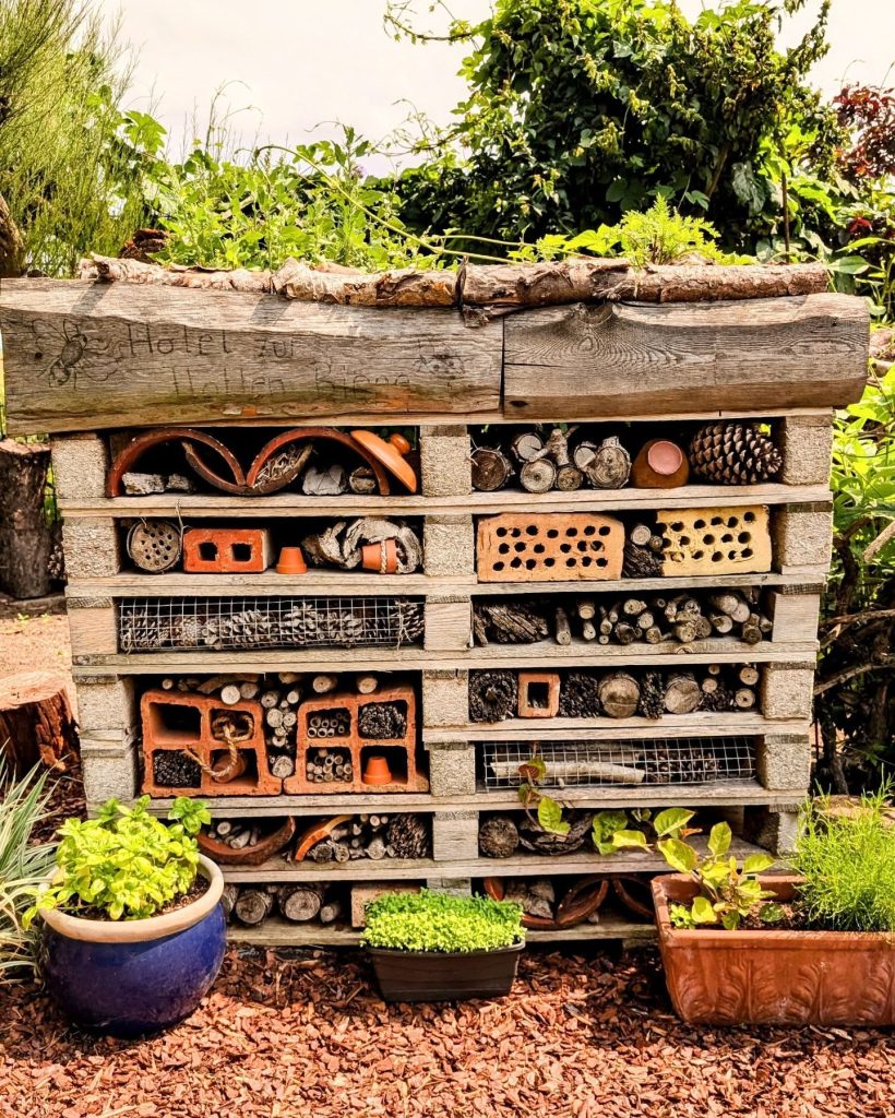 Surrounded by lush plantings and complemented by an array of terracotta containers, this bug hotel shows how modern ecological gardening can seamlessly integrate with traditional rustic aesthetics. The careful arrangement of different materials and textures creates visual interest while serving specific purposes for various insect species. This design approach represents the evolution of rustic gardening—honoring traditional materials and methods while embracing contemporary understanding of garden ecology and environmental stewardship.
