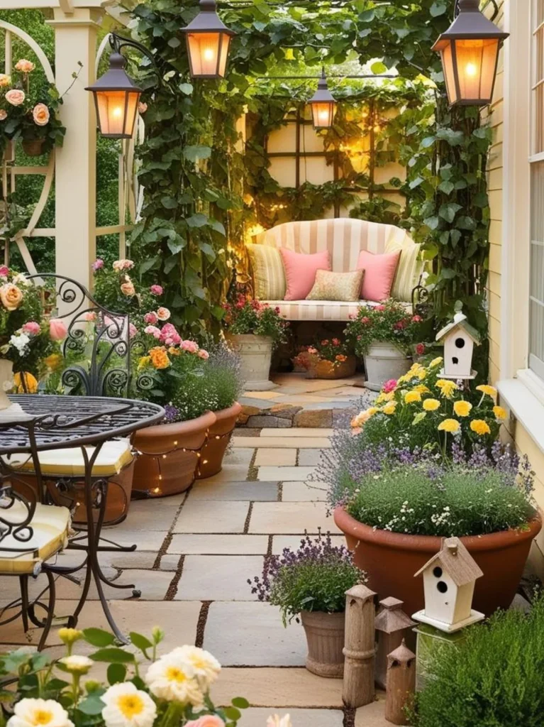 This magical outdoor space demonstrates how lighting can transform a rustic garden into an enchanting evening destination. Cream-colored lanterns hang at varying heights throughout the space, creating pools of warm light that dance across climbing roses, cottage flowers, and lush greenery. A striped bench nestled in an alcove becomes the perfect spot for quiet reflection, surrounded by terracotta pots overflowing with herbs and blooms.
