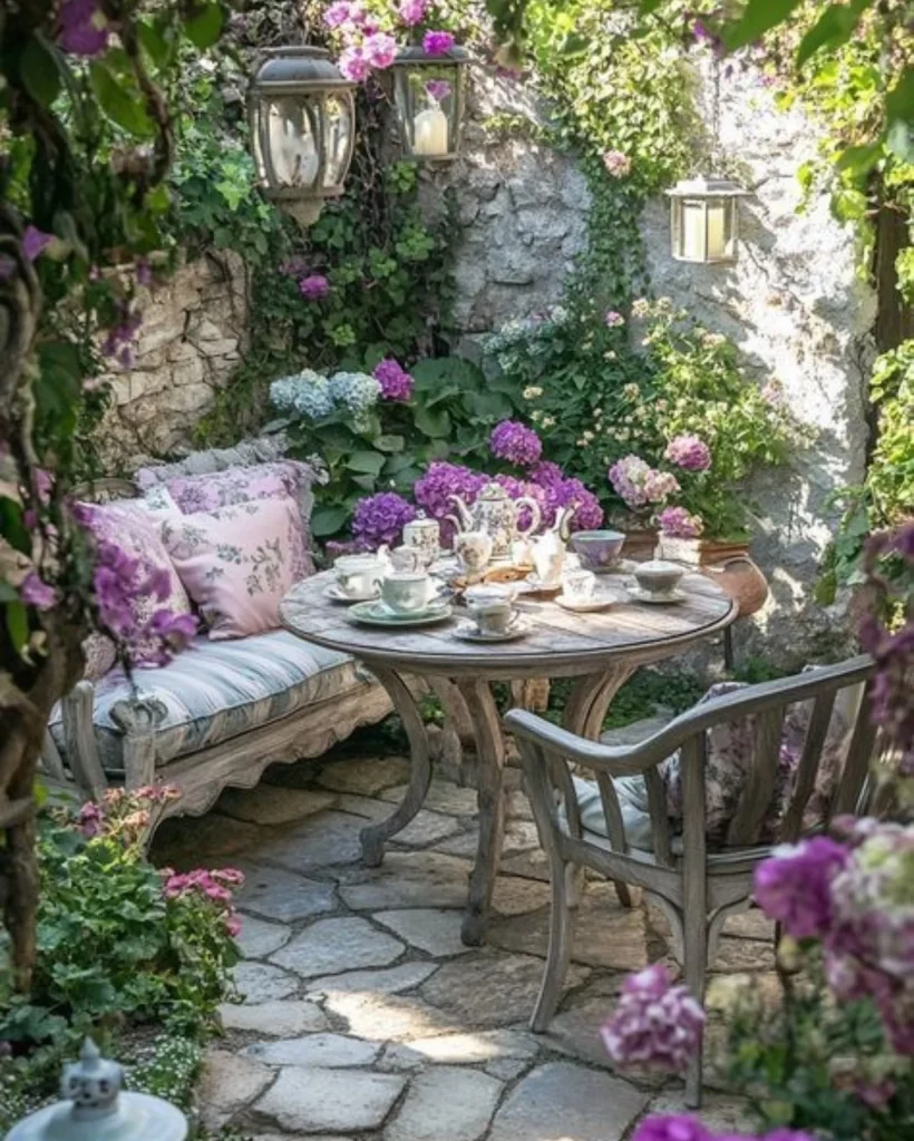 Nestled within aged stone walls, this intimate garden space feels like a discovered secret from a bygone era. Purple hydrangeas cascade dramatically around weathered stone surfaces, while vintage lanterns cast a romantic glow over a perfectly appointed tea setting on rustic wooden furniture. The enclosed nature of the space creates a sense of privacy and sanctuary, enhanced by the natural patina on every surface and the way climbing plants have claimed the walls as their own.