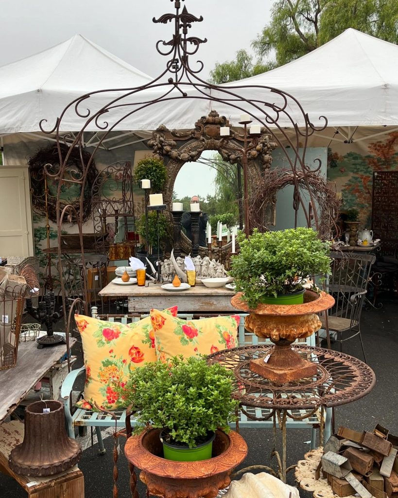 This enchanting outdoor space transforms the classic market garden aesthetic into a charming personal retreat. The centerpiece features an ornate wrought iron gazebo adorned with cascading lanterns, creating a magical focal point that draws the eye upward. Weathered wooden tables display an eclectic collection of vintage planters, terracotta pots, and cheerful yellow floral cushions that add pops of sunshine to the earthy palette.